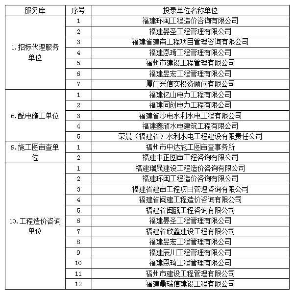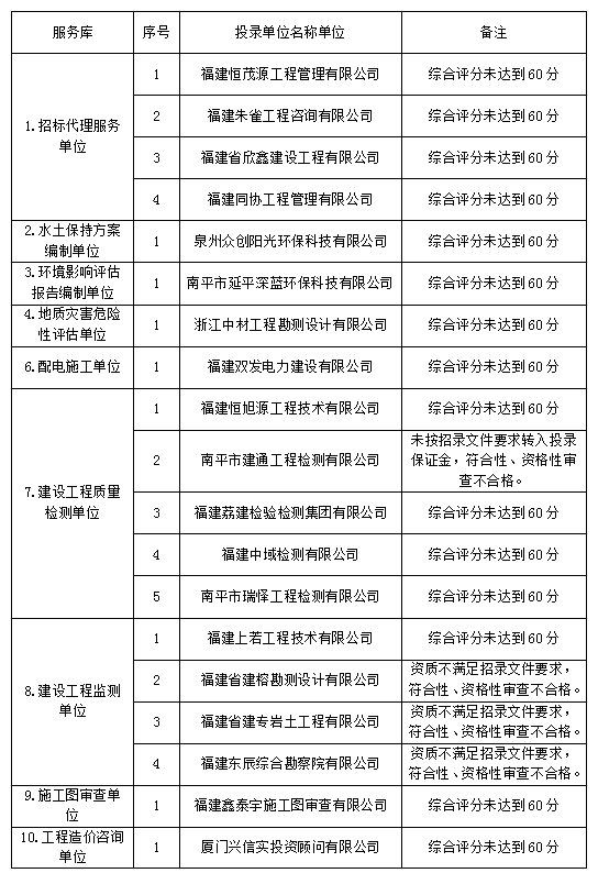 南平綠發(fā)集團(tuán)有限公司2023年服務(wù)庫招錄于2023年7月26日08:30時在福建暉源工程咨詢有限公司評審,經(jīng)評審委員會對投錄文件進(jìn)行評審,現(xiàn)將結(jié)果公示如下: 一、服務(wù)庫備選單位: