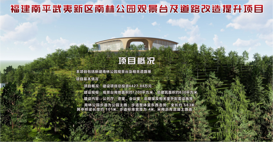 1月13日上午,福建南平武夷新區(qū)南林公園觀景臺及道路改造提升項目在南林公園舉辦開工儀式,該項目的代業(yè)主單位為福建省閩北水利水電工程公司。參加本次開工儀式的有:南平市武夷新區(qū)管理委員會、南平市城市公園服務(wù)中心、南平綠發(fā)集團(tuán)有限公司、南平武夷新區(qū)城市發(fā)展集團(tuán)有限公司、福建省閩北水利水電工程公司等主要單位及領(lǐng)導(dǎo)。 南林公園觀景臺及道路改造提升項目本項目包括新建南林公園觀景臺及相關(guān)道路等。建設(shè)項目總投資4427.88萬元。建設(shè)規(guī)模為觀景臺用地面積約1200平方米,總建筑面積約830平方米,建設(shè)內(nèi)容包含公共廳、茶室、會議室、后勤室及相關(guān)室外配套設(shè)施等;南林公園步道為公園主路,步道整體呈東西走勢,全長約 583m,其中橋梁長度約 101m,步道標(biāo)準(zhǔn)寬度為 4m,采用瀝青混凝土路面。