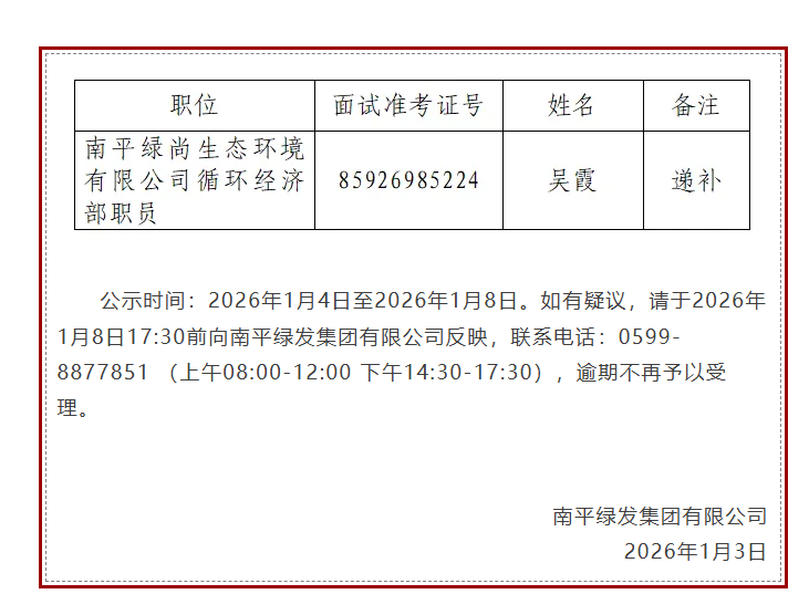 南平綠發(fā)集團(tuán)有限公司公開招聘擬遞補(bǔ)聘用人員公示